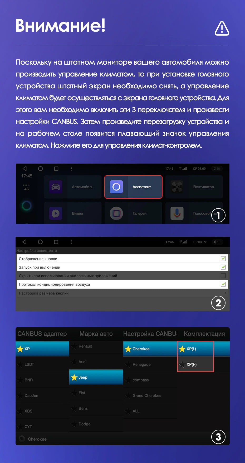Установочный комплект для Jeep Cherokee 5 KL (2014-2018) включает переходную рамку и проводку.